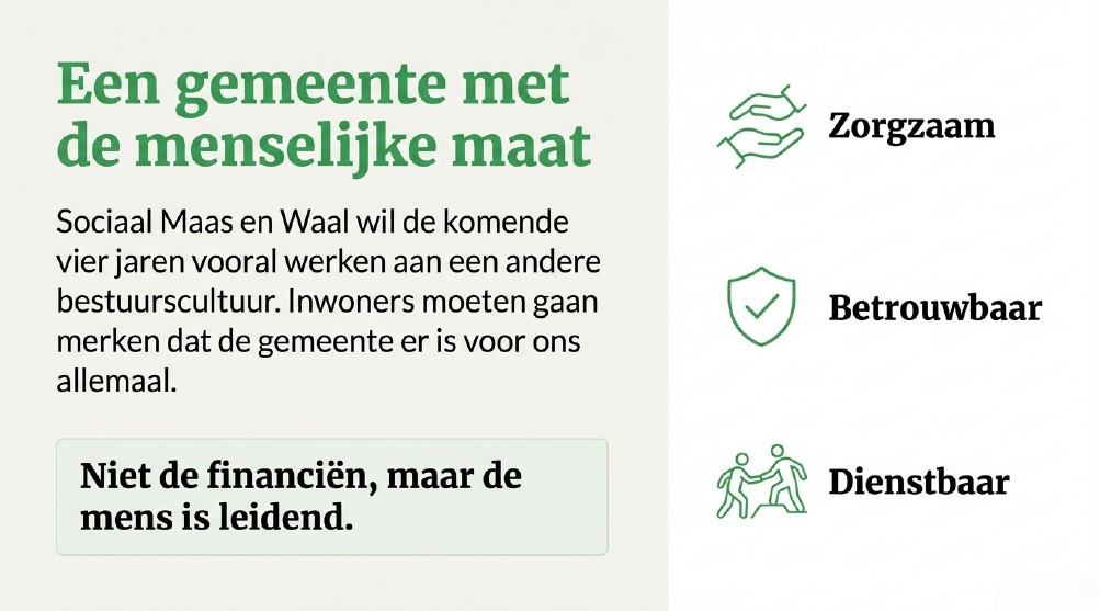 Sociaal Maas en Waal wil de komende vier jaren vooral werken aan een andere bestuurscultuur. Een cultuur waar de menselijke maat leidend is en niet de financiën leidend zijn. Inwoners moeten gaan merken dat de gemeente er is voor ons allemaal. Elke inwoner mag verwachten dat er serieus wordt omgegaan met hun vragen, ideeën, of klachten. We willen een zorgzame, betrouwbare en dienstbare gemeente zijn.