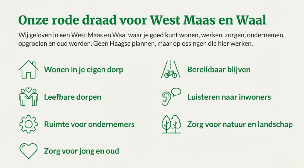 Wij geloven in een West Maas en Waal waar je goed kunt wonen, werken, zorgen, ondernemen, opgroeien en oud worden. Waar mensen naar elkaar omkijken en waar de gemeente doet wat nodig is. Geen Haagse plannen, maar oplossingen die hier werken, het liefst in samenwerking met partners in Maas en Waal.